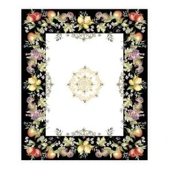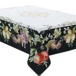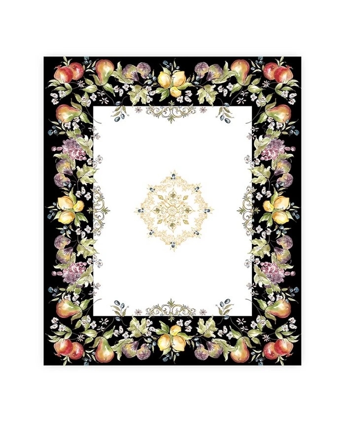This food-inspired tablecloth “Tuscan Fruit Sketch” features watercolor fruit, pomegranates, lemons, figs, pears, grapes, and a contrasting black background. In addition, the clean white center dazzles with three golden medallions as the focal point.