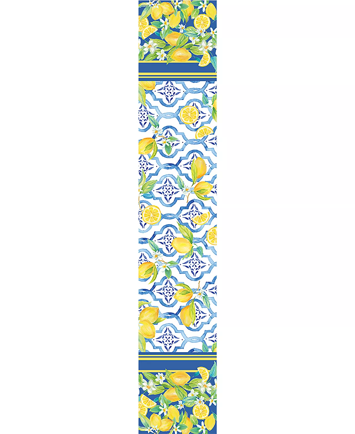 This seasonal runner, “Lovely Lemons” will truly liven up any dining room. The design features vibrant, yellow lemons with daisies against a bold blue background and quatrefoil center for an elegant feeling. Add this soft to the touch runner to your dining decor for a modern and beautiful look.