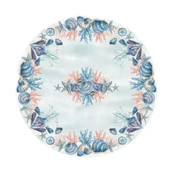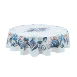 This coastal inspired tablecloth, “Venice Beach,” creates a serene ocean sanctuary. The design features an aquatic scene of detailed jewel toned shells and coral set a blue textured background. “Venice Beach” will make a unique and fun addition to your dining decor.