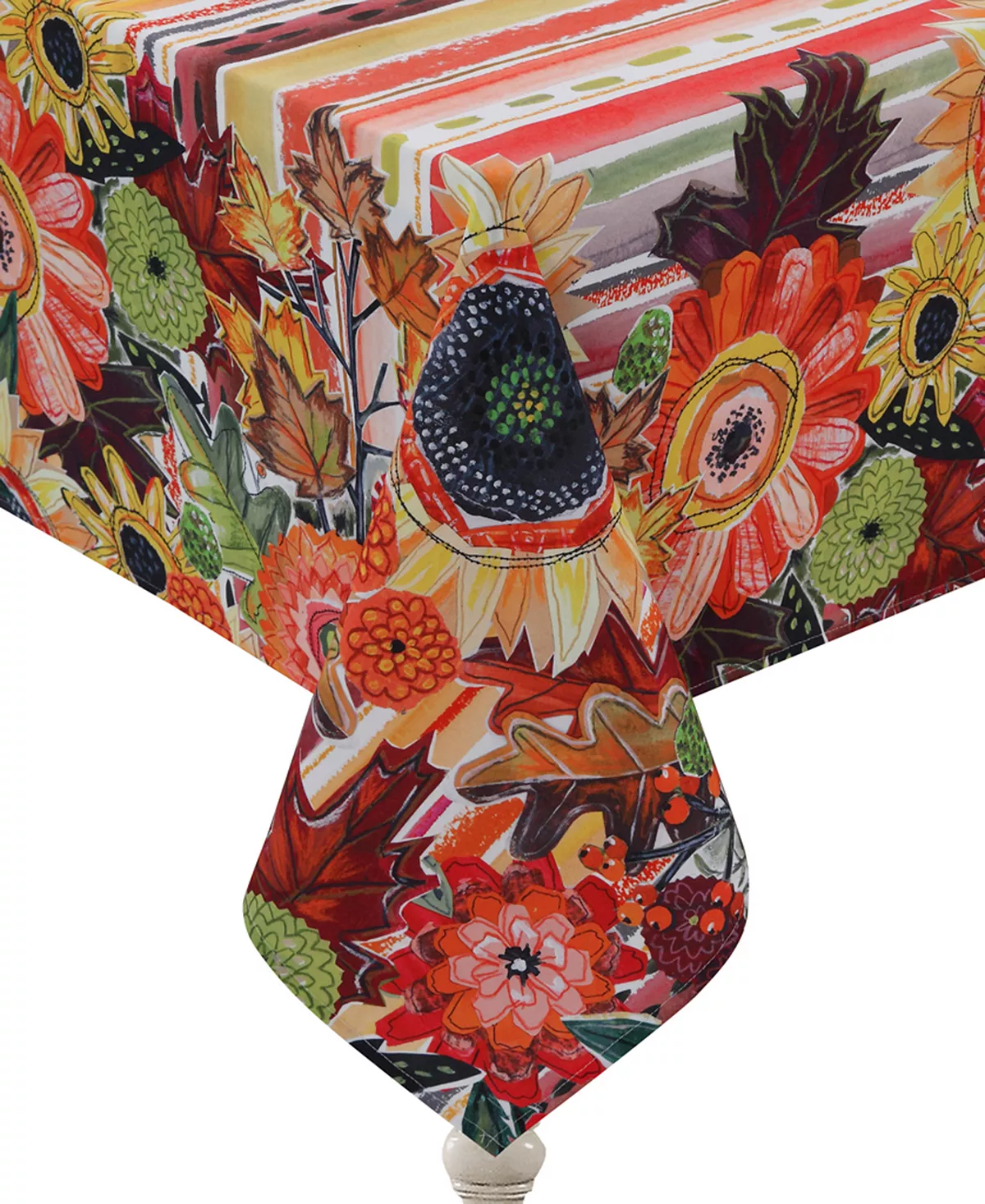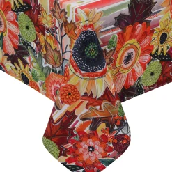 The watercolor collage design of the “Harvest Snippets” tablecloth is sure to bring autumn cheer to your kitchen. This design features a border of autumn foliage. Stripes in colors of red, green, and yellow create a brilliant centerpiece.
