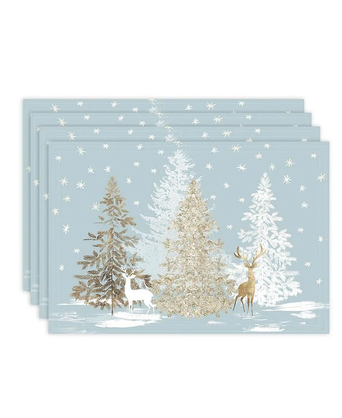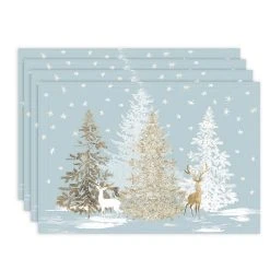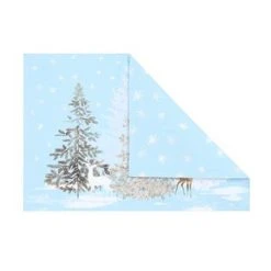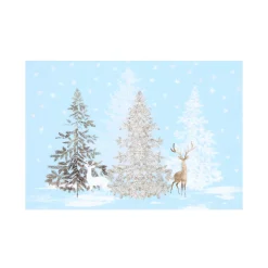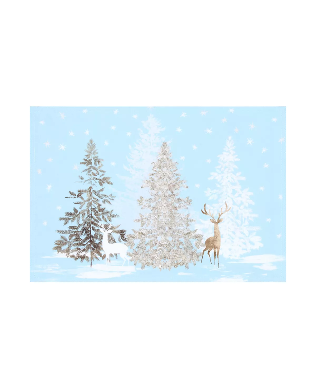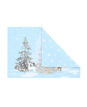 This seasonal-themed reversible runner, “Winter Wonderland” features an elegant wintertime scene. Gold-tone and white colors highlight deer and pine trees, set against an icy blue background and falling snow. Add this beautiful design to your table for the perfect seasonal look.