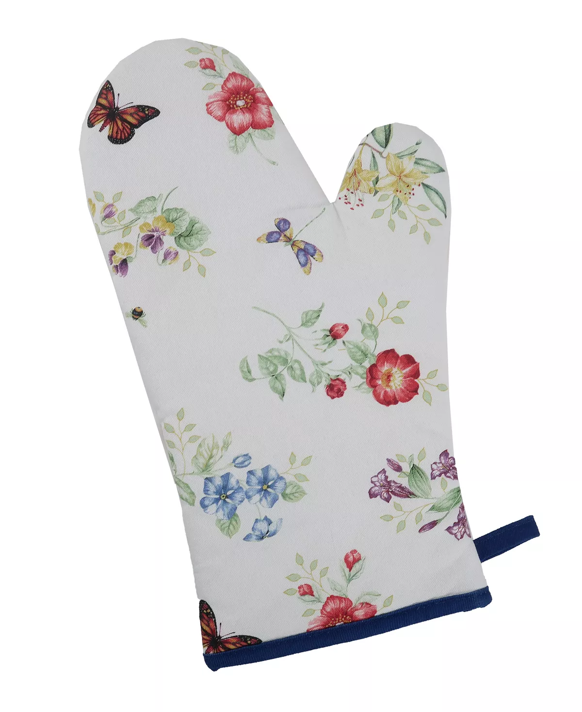 Lively butterflies, dragonflies and bumblebees buzz about a variety of vibrant flowers on this new Butterfly Meadow Oven Mitt.