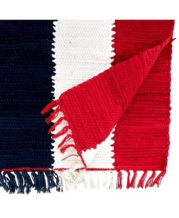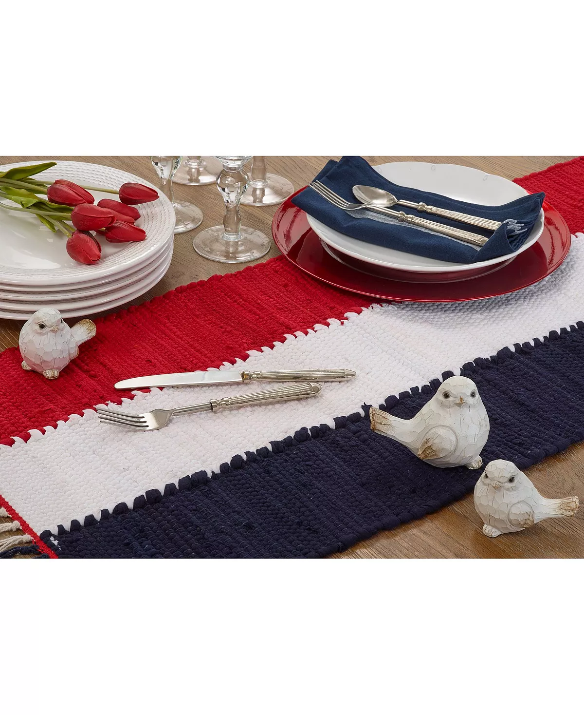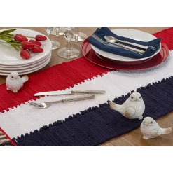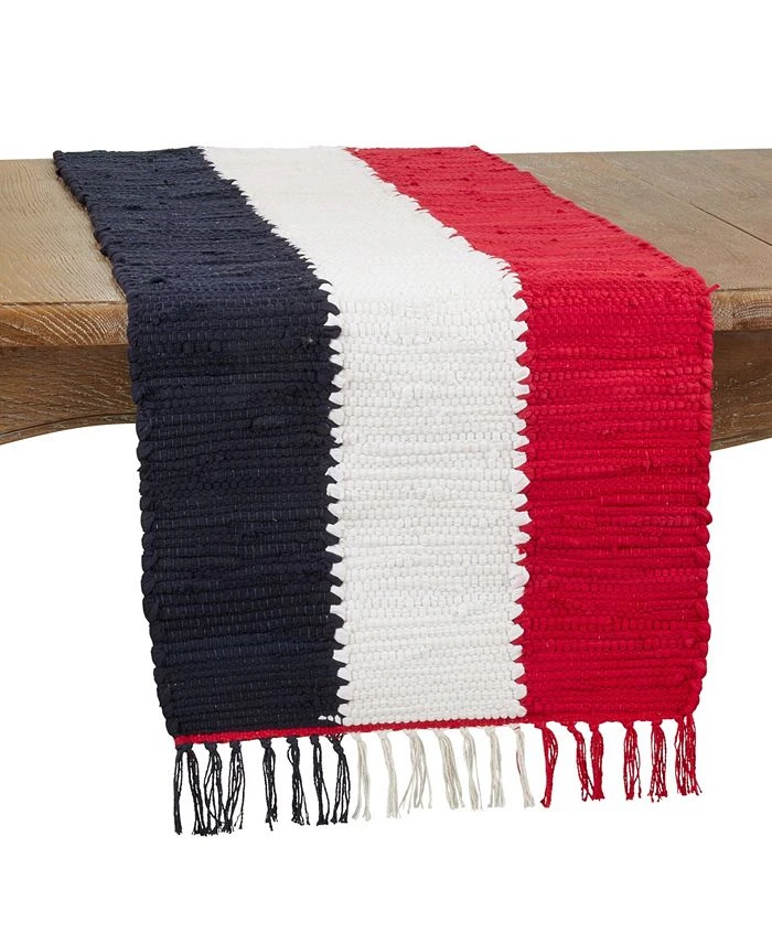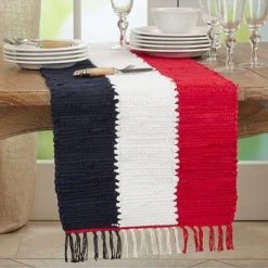 Perfect for family gatherings and multiple celebrations, the patriotic chindi table runner brings a wonderful homey ouch to your tabletop. It features the colors of the flag, together with a texturized design, which makes it easy to pair with solid colors and different table linens.