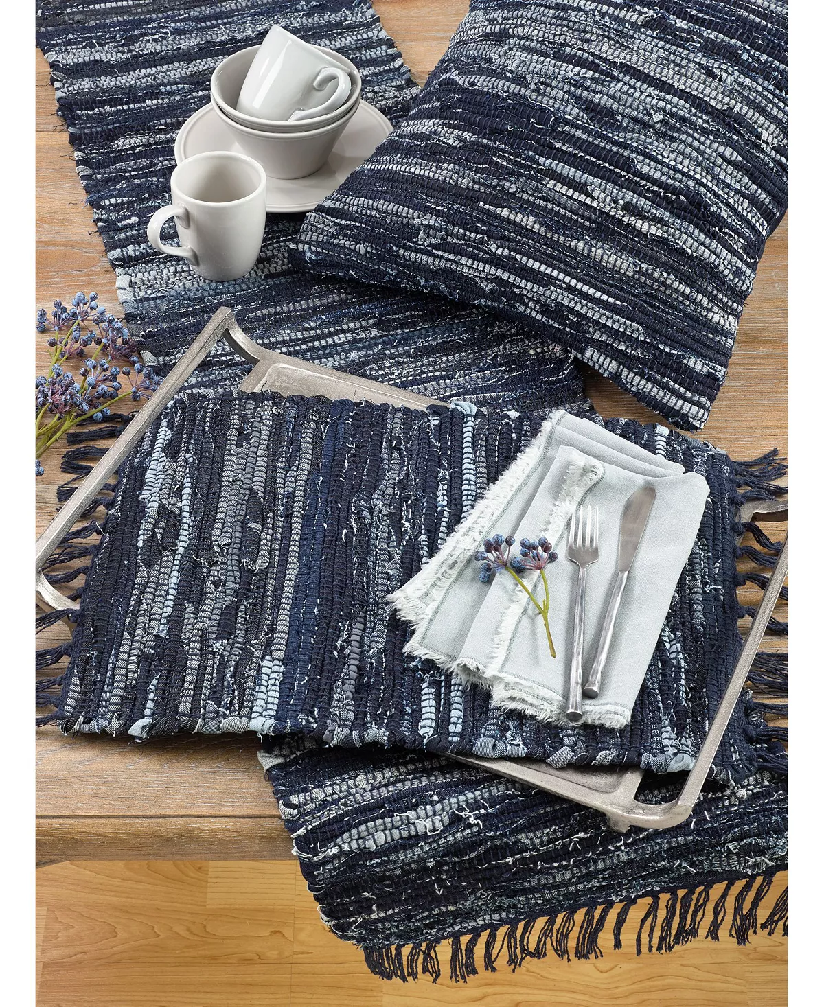 Set a boho-chic tone with this beautiful Denim Chindi Table Runner. Its thick woven texture and tasseled edges give dimension to the tablescape, while preserving a down-to-earth tone. Pair with chindi placemats for a cohesive look.