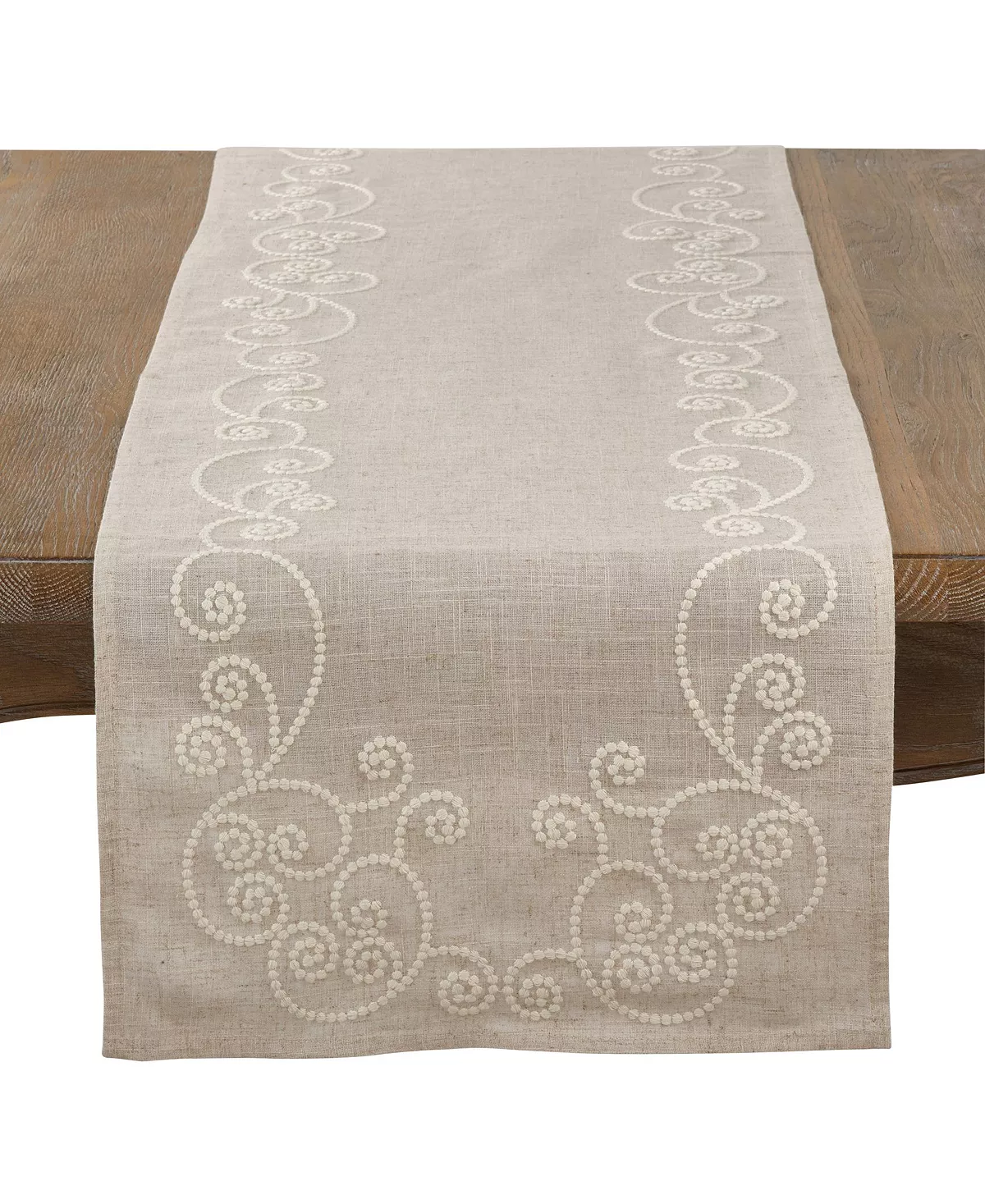 Whimsical embroidered swirls bring a playful quality to this beautiful table runner. Featuring a linen-blend construction, the swirl embroidered runner offers a natural look perfect for everyday use. Pair with matching table napkins for a coordinated look.