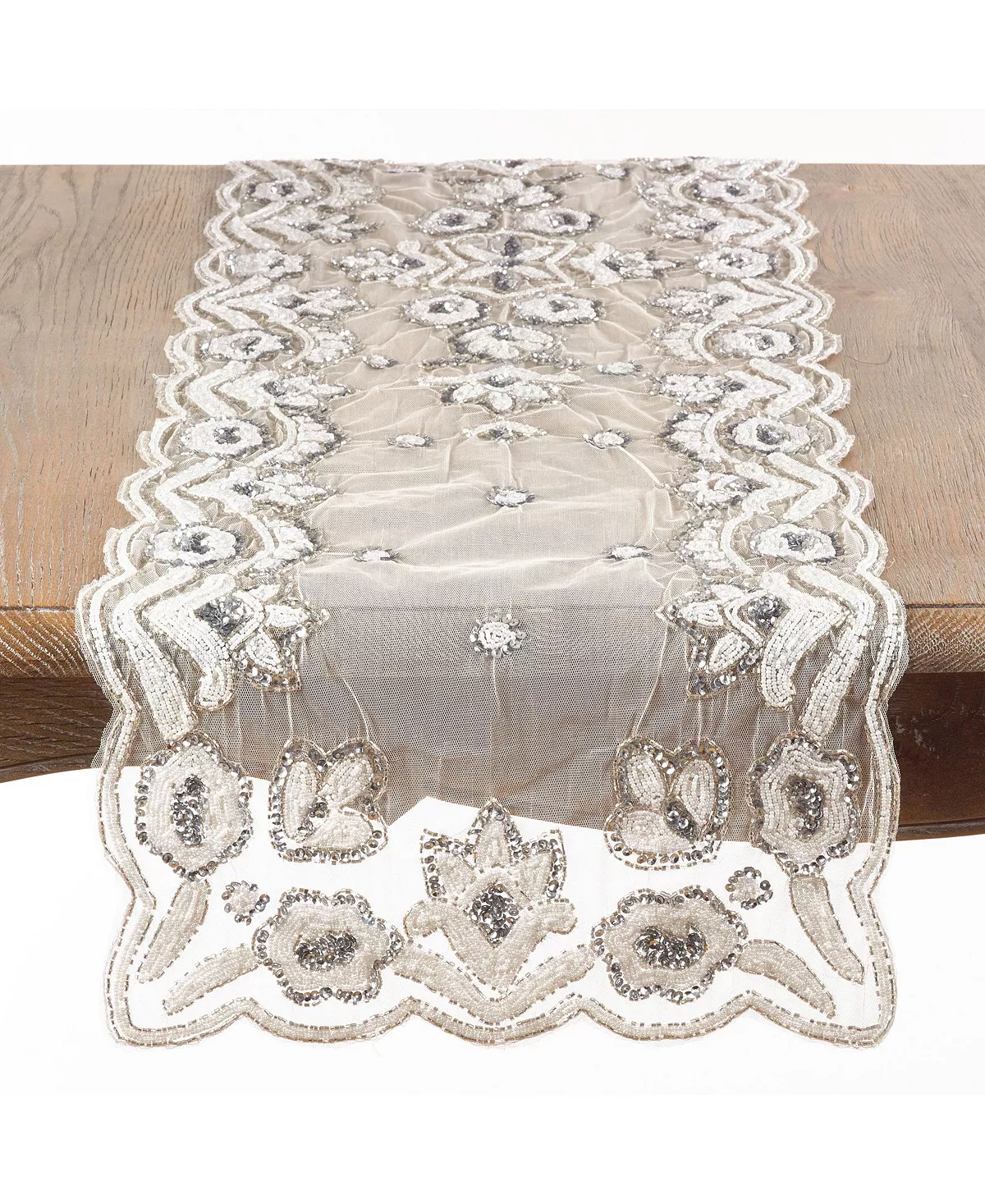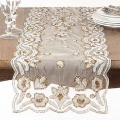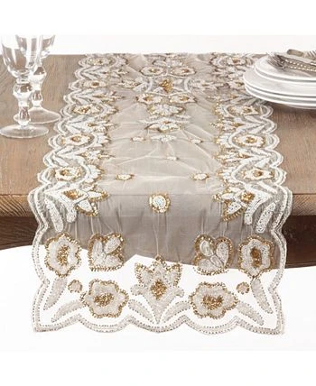 This hand-beaded table runner adds a touch of elegant flair to your dining room tablescape. Featuring a beautiful beaded floral pattern, the runner is sure to delight with its charming flourishes and looks stunning paired with metallic accents.