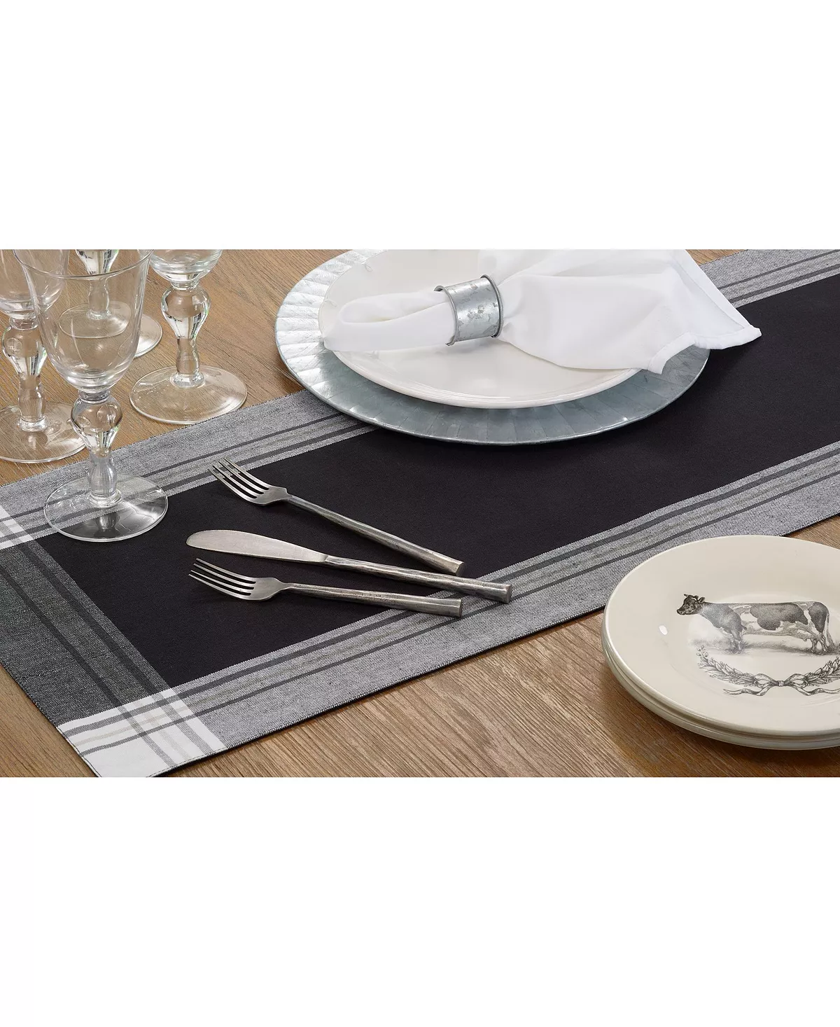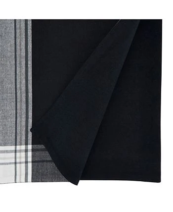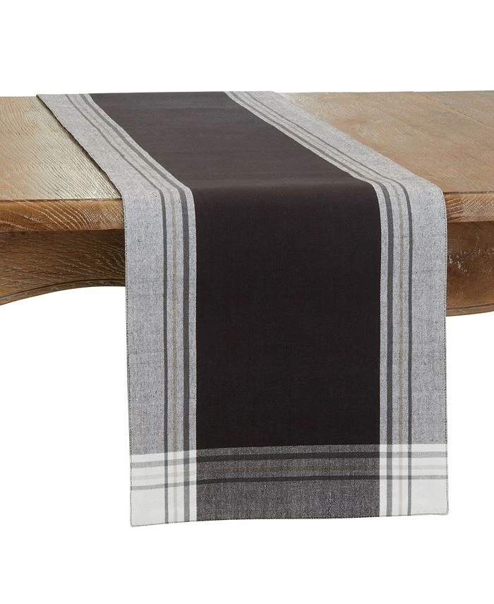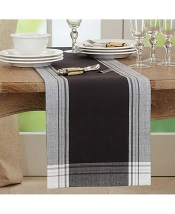 The stripe border table runner brings a deep note to your tabletop, as it features contrasting thin stripes around the border of a black background. Pair it with white plates and dinnerware to achieve a beautiful, contrasting look.