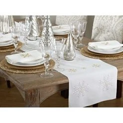This holiday season, take a turn towards elegant table dΓ©cor with this gorgeous snowflake design table runner. With neutral tones and glowing accents, this runner will add grace and finesse to your holiday table. Pair with shimmery placemats or chargers for a complete wow effect.