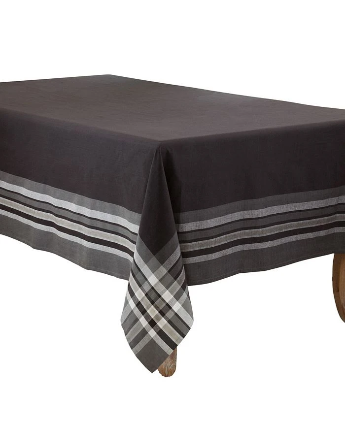 Protect your dining table from spills and scratches with this stylish, yet casual stripe border tablecloth. Gives a natural look and feel to your decor and delivers great durability. The dark tone background makes it easy to pair with a wide range of table linens and dinnerware.