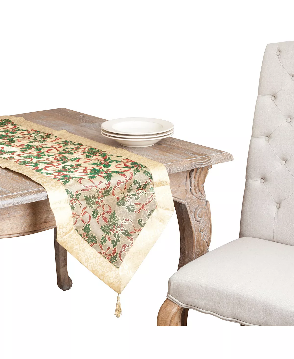 Make a festive statement on your dining table this holiday season while entertaining this table runner features a sheer shimmery design with gold satin border with a holly and bow print.