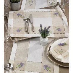 For a sunny yet sophisticated tone, lay out this gorgeously detailed table runner. Lightly striped linen-blend panels with open hemstitch detail pop with colorfully embroidered lavender.